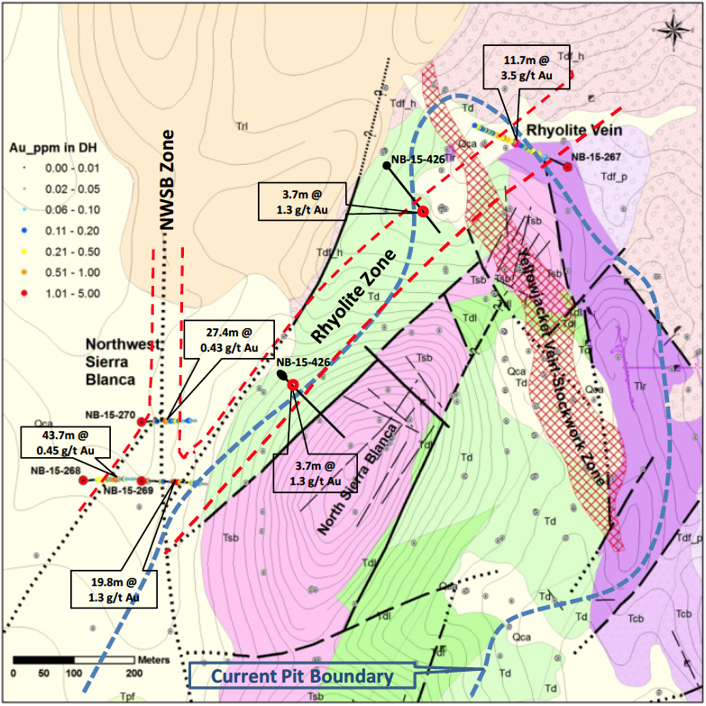 The new NW Sierra Blanca Zone is covered by a thin (<20m) veneer of post-mineral, volcanic rocks and gravels. The zone appears to be dominated by two structural zones, the north-south NWSB zone and the NE trending Rhyolite Zone. The intersection of these two major structural zones was hit in hole NB-15-269 that returned a broad intercept of +1 g/t with stockwork mineralization at less than 100 metres vertically in the system (similar to upper levels of the YellowJacket system).