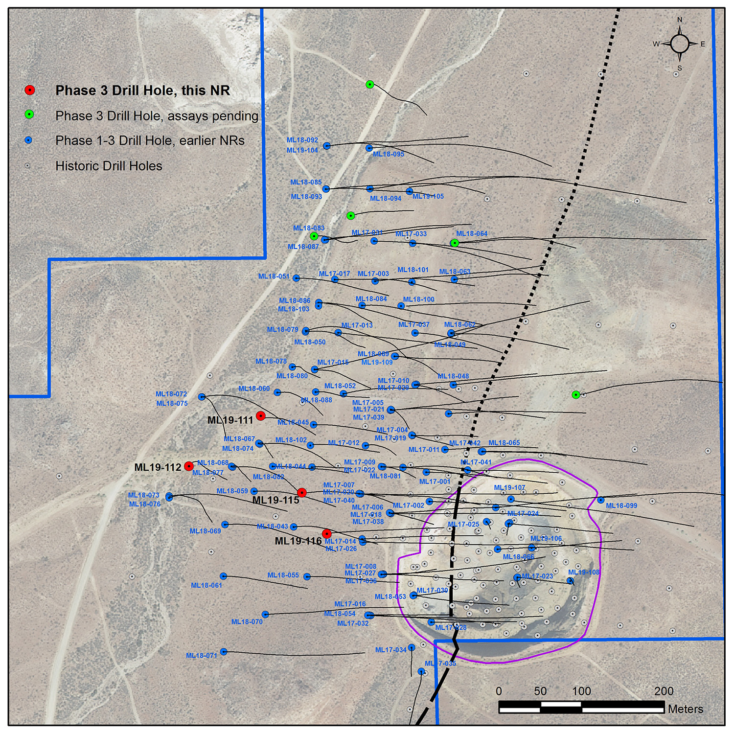 In this important Western extension of the Mother Lode deposit, hole ML19-116 (36.6m @ 2.03 g/t gold & 25.9m @ 2.43 g/t gold, as detailed in Table 1 below) has a deep intercept that intersected a dike in the lower plate carbonates, below the main deposit, which like other intrusive related deep intercepts consistently returns +2 g/t gold with broad core zones of +3 g/t gold. These results continue to outline a deeper, hotter, intrusive related, lower plate hosted, gold system like the deep intercepts in holes ML19-104 (NR19-05, Mar. 19, 2019) with 16.8m @ 4.4 g/t gold and the bottom of hole ML19-109 (NR19-06, Apr. 3, 2019) which ended in 4.1 g/t gold, and will be the focus of the next round of exploration at Mother Lode.